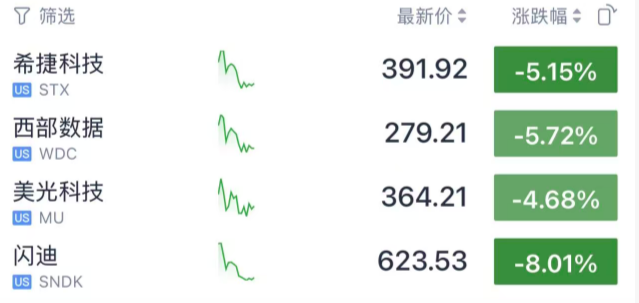 存储芯片板块暴跌,成为了重灾区,闪迪跌约8%,美光科技跌约5%。